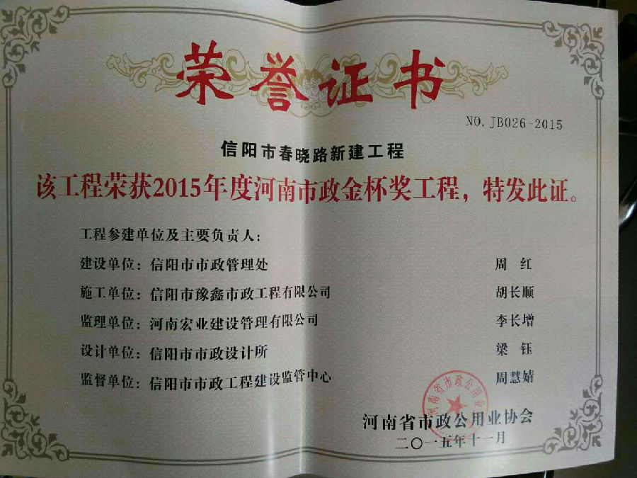 好風憑借力,送我上青云。近年來,公司積極參與城市市政基礎(chǔ)設(shè)施建設(shè)施工,積極參與市場競爭,先后承擔施工了市政府重點工程南京路道路改造工程、春曉路道路改造工程,東方紅大道道路改造工程、龍江東路新建工程等重點民生工程,其中南京路道路改造工程被省建設(shè)廳評為“中州杯”, 春曉路和東方紅大道道路改造工程被省建設(shè)廳評為“省優(yōu)工程”,成為城區(qū)一道道亮麗的風景線。參與施工了市典范小區(qū)“臺北城上城”、“恒大名都”以及師范學(xué)院、職業(yè)技術(shù)學(xué)院、交警支隊和軍區(qū)道路工程,參與施工了雞公山管理區(qū)、南灣管理區(qū)、明港鎮(zhèn)和羅山縣等部分道路小區(qū)工程施工,累計大小各類施工工程三百余項,企業(yè)影響力不斷擴大、輻射力不斷增強,市場份額不斷提高,企業(yè)信譽不斷彰顯,為信陽城市建設(shè)做出了積極貢獻,為企業(yè)的可持續(xù)發(fā)展插上了騰飛的翅膀。